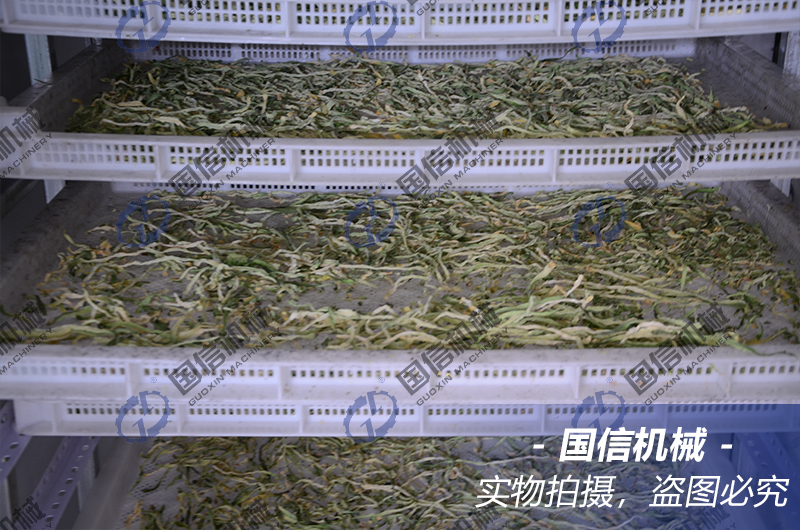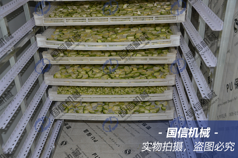 首先將溫度設(shè)置到43-48℃,濕度保持53℃,時間1-2小時,它使蔬菜表面的水分吸收能量變?yōu)樗魵夂蟠罅克舭l(fā)出去。當(dāng)熱氣流速越快,溫度越低,而烘干房相對濕度越小,同時含水率下降,干燥速度加快。