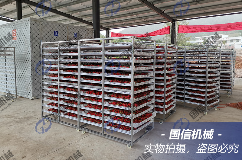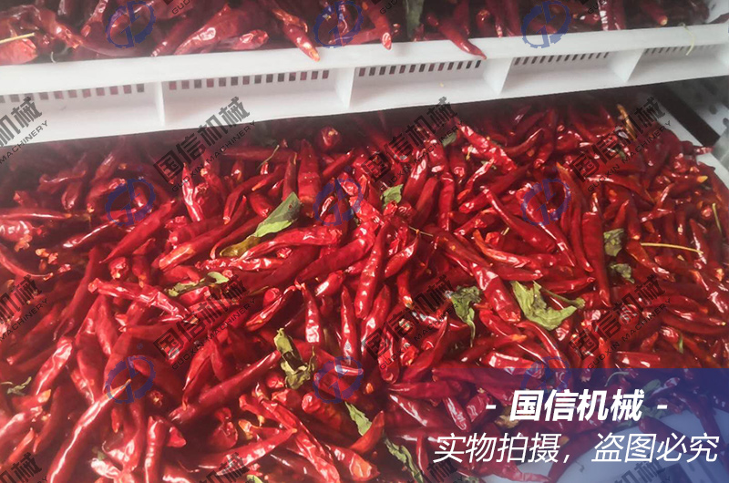 3、二次烘干階段:為保證成品辣椒干貨的品質(zhì),此階段需要辣椒鋪料均勻,堆放不可太厚,保證良好的透氣性,設(shè)置溫度在60~70℃,時(shí)長(zhǎng)在6~8個(gè)小時(shí)即可。