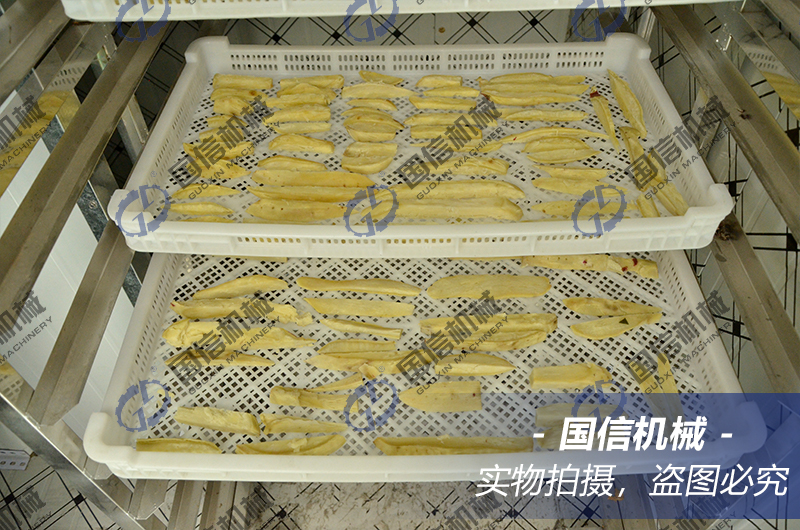 6.烘干:將切好塊或條狀的地瓜(紅薯)均勻擺放于托盤,后放置在推車推入烘干房,通過空氣能熱泵烘干房的觸摸屏進行烘干設置,初始溫度設置65℃,時長設置四小時,第二段溫度60℃,時 間長度也是四小時,第三階段將溫度設置到55℃,烘干到預期的水分含量后,空氣能地瓜烘干房會自動完成整個烘干過程,結(jié)束后自動停止。