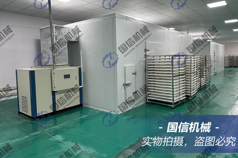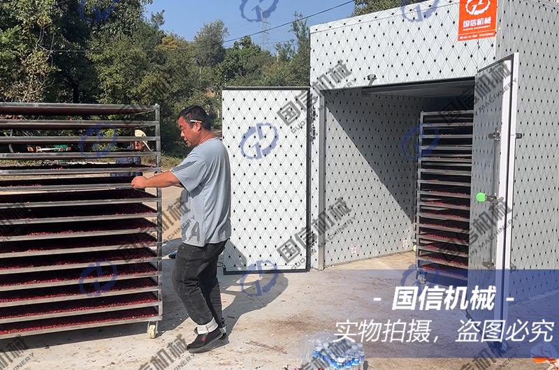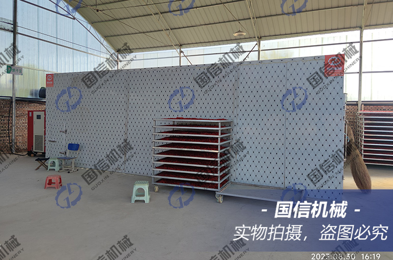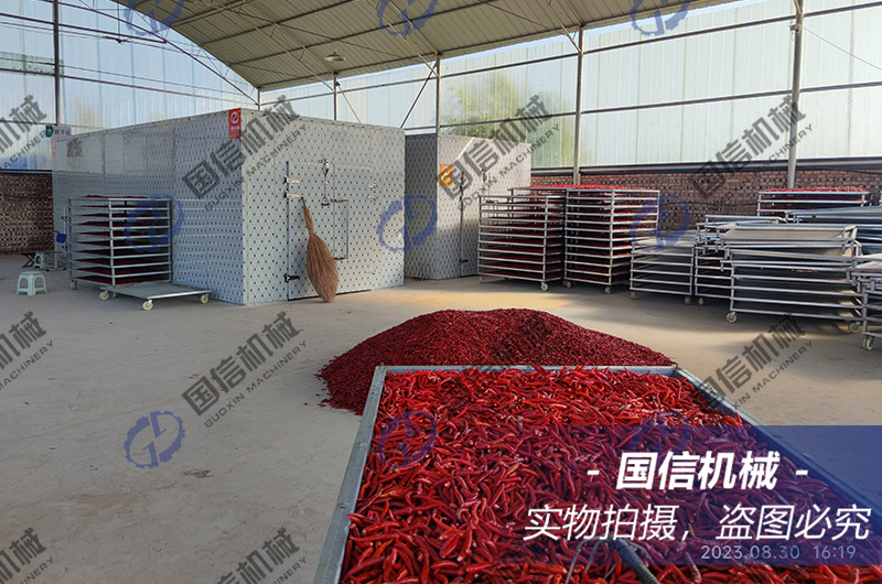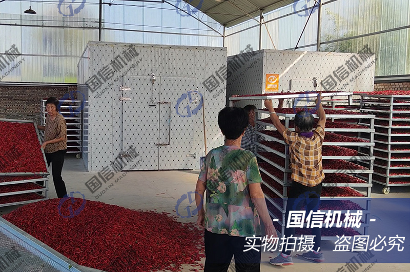 辣椒送入烘干房?jī)?nèi)迅速升溫至50℃左右,使辣椒快速接觸到熱風(fēng)發(fā)汽,加強(qiáng)排濕,保證顏色品質(zhì),不給辣椒熟化轉(zhuǎn)變時(shí)間,至辣椒表面干燥縮水,濕度控制在50%左右,時(shí)間保持在10-20個(gè)小時(shí)。